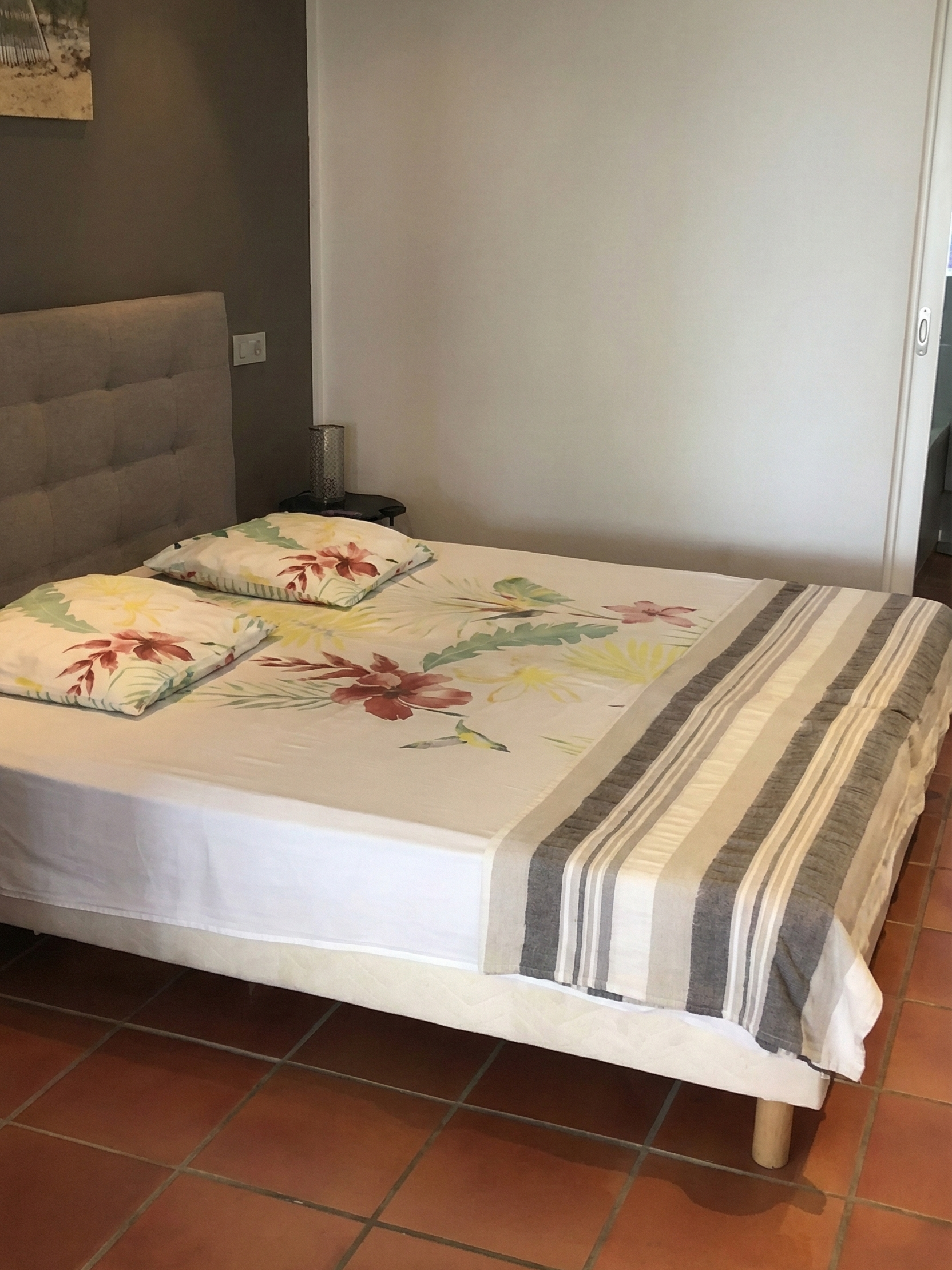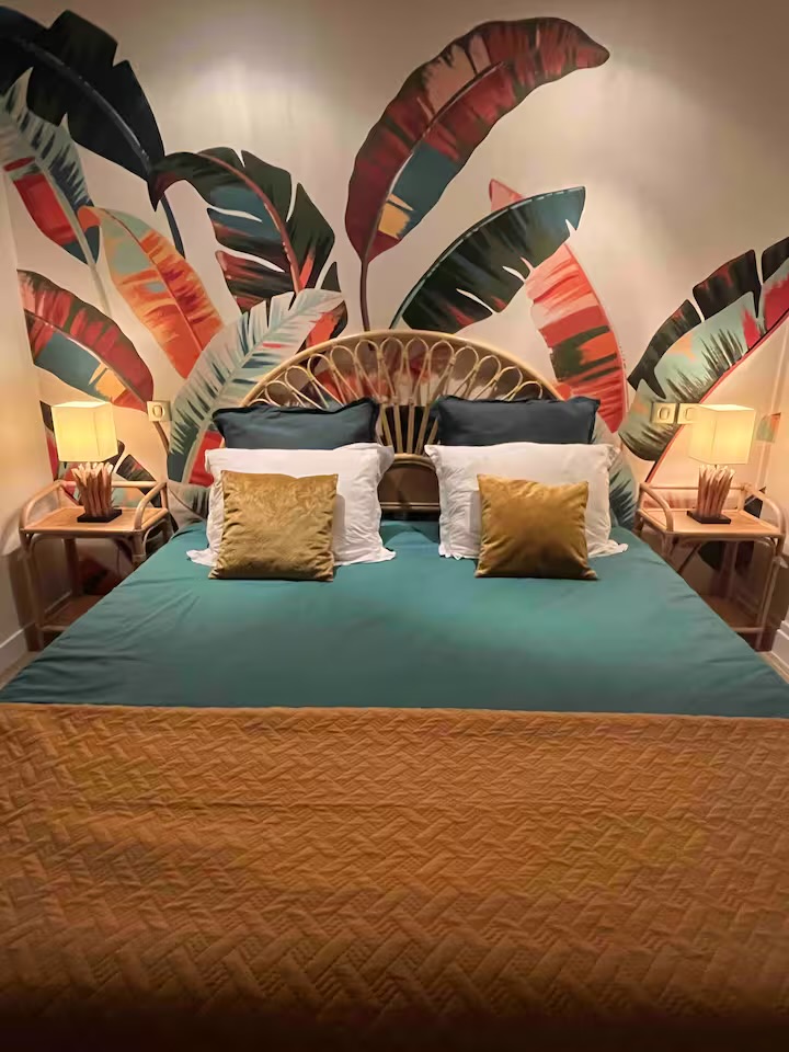 - L’Apaisement (Le bleu Canard et le vert) : Sur les murs et en tête de lit, ces teintes profondes ancrent l’espace. Elles rappellent la luxuriance de la nature guadeloupéenne et favorisent physiologiquement le ralentissement du rythme cardiaque pour le repos.