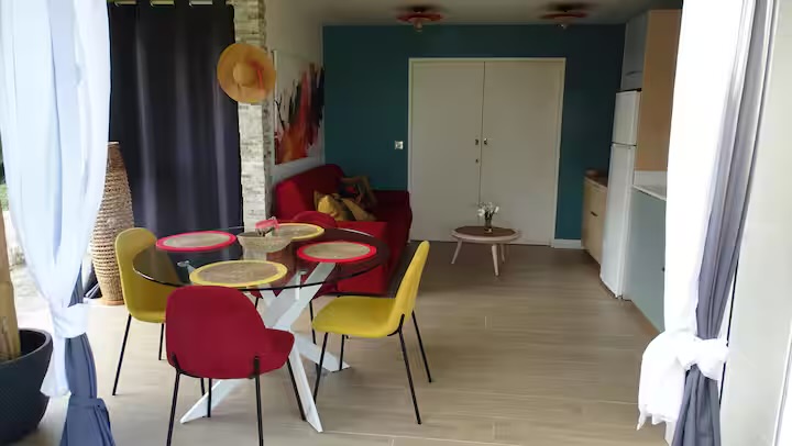 - L’Énergie (Le rouge et le jaune) : Des touches chaudes (canapé, coussins, chaises) apportent la joie et le mouvement. Elles invitent à la convivialité et à la fête.