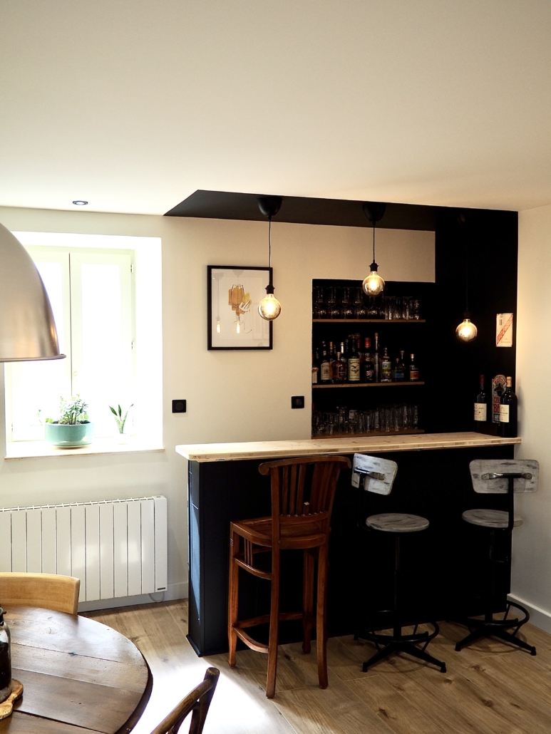 - Le Zoning : Un espace bar a été créé, délimité visuellement par un contraste fort Blanc / Bleu Nuit, seule exception chromatique structurelle pour marquer la fonction.
