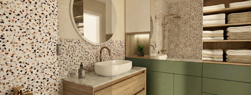 Ce projet de conception 3D répond à une urgence heureuse : l’arrivée future d’un bébé pour un jeune couple. La salle de bain existante présentait deux défauts majeurs : elle était très sombre et manquait cruellement de fonctionnalité (un simple rangement sous lavabo). La mission était claire : créer un espace ultra-optimisé, capable d’intégrer un plan à langer et de nombreux rangements, tout en respectant une envie décorative forte autour du Terrazzo et du Vert Sauge.